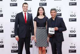 Am 24. Juni 2016 wurde Elementar auf dem Deutschen Mittelstands-Summit in Essen erneut als eines der innovativsten Unternehmen im deutschen Mittelstand ausgezeichnet - bereits zum sechsten Mal in Folge. Dr. Marc Ruppenthal, Product Manager Elemental Analysis, und Fabienne Texier, Marketing & External Communications Manager, nahmen das "TOP 100"-Siegel entgegen, das von Mentor Ranga Yogeshwar überreicht wurde (Foto: KD Busch/compamedia GmbH).