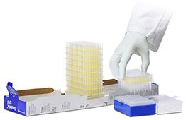Das tipfill™-System beinhaltet jeweils einen Stapel vorgefüllter Spitzeneinsätze, welche direkt in ein leeres Rack eingesetzt werden können. Das System benötigt wenig Stauraum, der Karton ist wiederverschliessbar und ideal zur Aufbewahrung auf der Laborarbeitsfläche.
